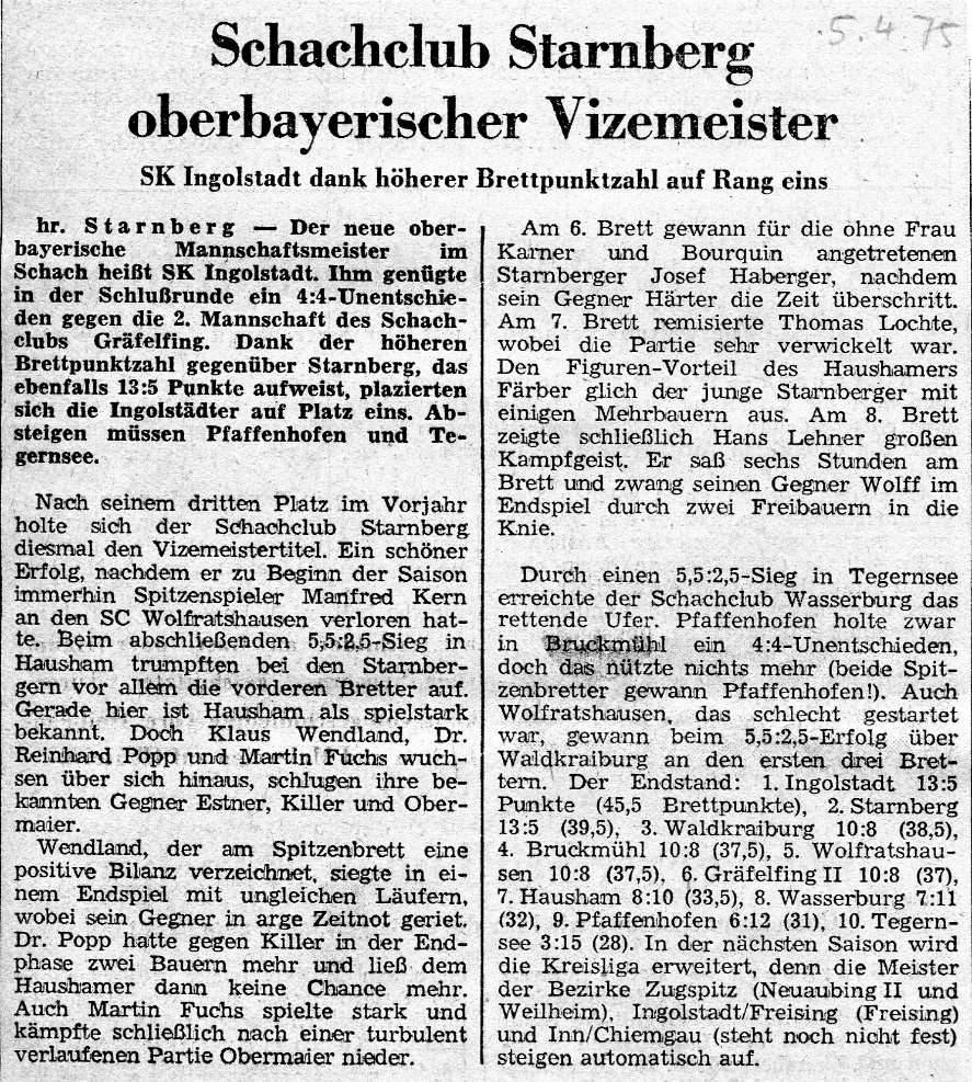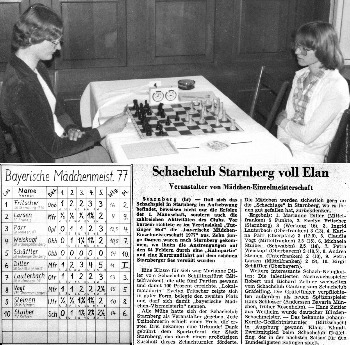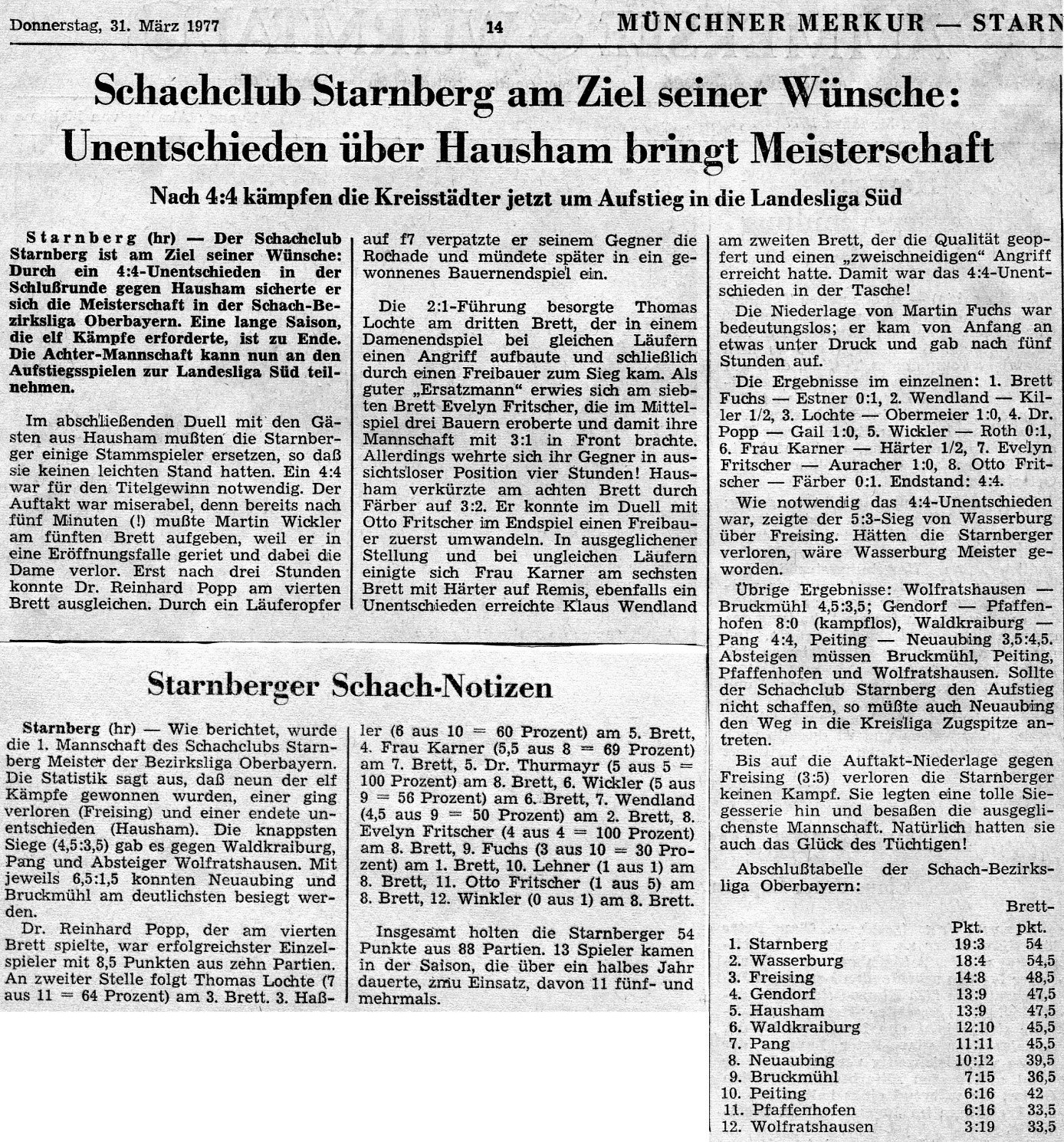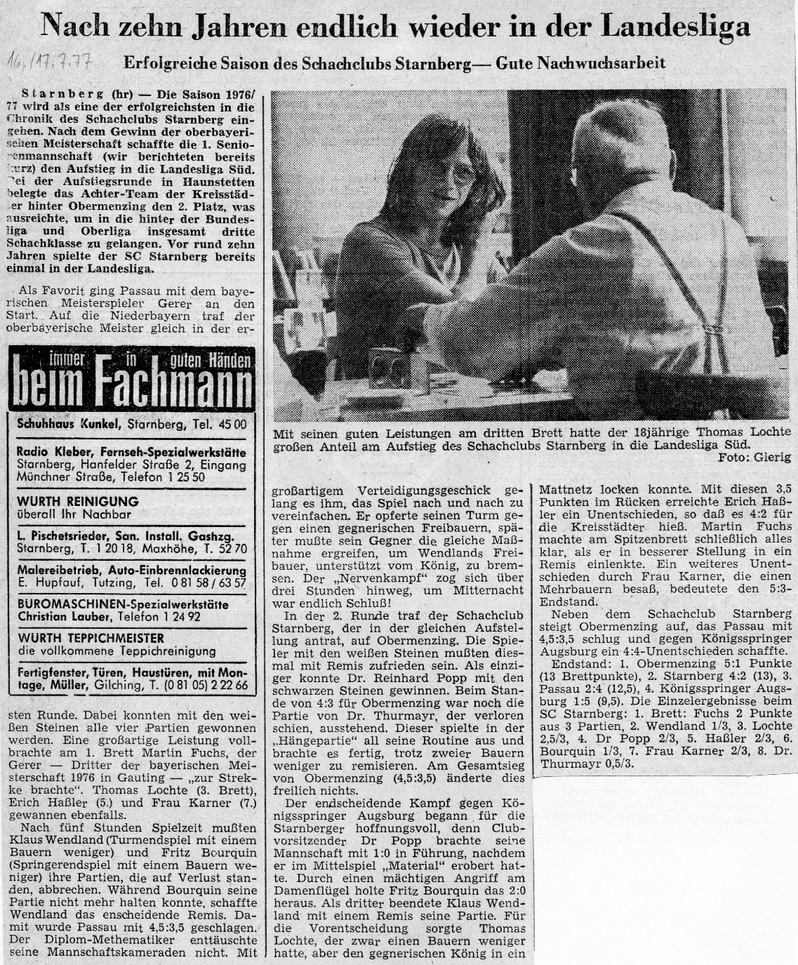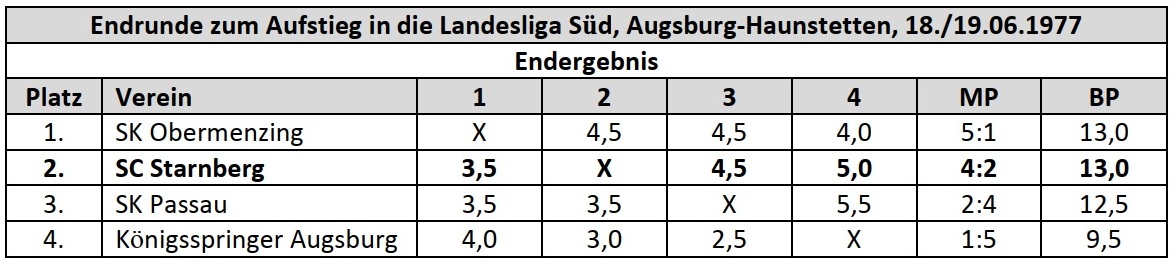 Das Qualifikationsturnier zum Aufstieg in die Landesliga Süd fand von 18.-19.06.1977 in Augsburg-Haunstetten statt. Zum Auftakt saß der Starnberger Auswahl das als sehr stark eingeschätzte Oktett des SK Passau gegenüber. Der Wettkampf begann frühmorgens, endete aufgrund zweier Hängepartien aber erst gegen Mitternacht! Nicht weniger bemerkenswert war der Umstand, dass auf beiden Seiten die Spieler mit den weißen Steinen klar im Vorteil waren. Das SKS-Ensemble gewann durch Martin Fuchs (Brett 1), Thomas Lochte (3), Erich Haßler (5) und Irmgard Karner (7) sogar alle seine Weißpartien. Gleichzeitig musste man aber alle Schwarzpartien abgeben – mit Ausnahme der Begegnung des tapfer kämpfenden Klaus Wendland (2). Auch der zweimalige Starnberger Klubmeister hatte durchweg einen schweren Stand. Doch dank zäher Verteidigung schaffte er es die Stellung so weit zu vereinfachen, dass am Ende des Tages (im wahrsten Sinne des Wortes) nur noch die blanken Könige auf dem Brett standen – 4,5:3,5 für Starnberg!
