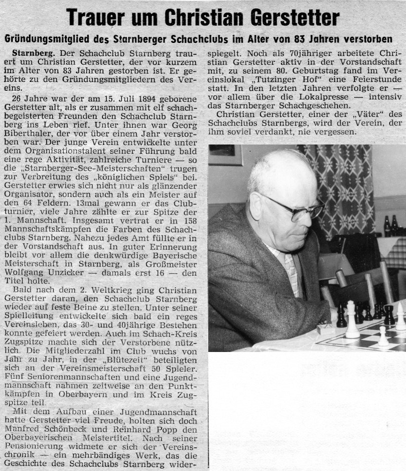 Man kann wohl mit Recht annehmen, dass sich Christian Gerstetter über die gelungene Symbiose in der 1. Mannschaft zwischen jungen und älteren Spielern sowie die erfolgreiche Integration von zwei weiblichen Denksportlerinnen ganz besonders gefreut hat. Schließlich wurden unter dem Gründungsmitglied und langjährigen Vorsitzenden des Klubs am 01.10.1953 sowohl die erste Jugendabteilung als auch eine Damensparte ins Leben gerufen (siehe Kapitel 3). Bedauerlicherweise durfte sich Gerstetter aber nur wenige Monate über den Erfolg seiner schachlichen Erben freuen. Denn am 27.01.1978 verstarb das Ehrenmitglied, er wurde 83 Jahre alt.
