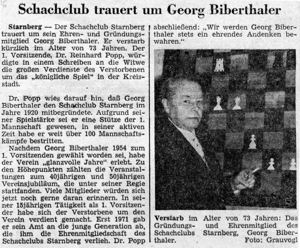 Das Ableben von Christian Gerstetter war für die Mitglieder des SK Starnberg womöglich umso schmerzhafter, da etwa ein Jahr zuvor eine weitere Klublegende das Zeitliche gesegnet hatte. Georg Biberthaler, von September 1954 bis September 1971 Vorsitzender des Vereins, verstarb am 14.12.1976 im Alter von 73 Jahren. Wie Gerstetter zählte auch Biberthaler am 01.09.1920 zu den elf Gründungsmitgliedern des SK Starnberg, er war damals gerade 17 Jahre alt. Im Gegensatz zu Gerstetter war Biberthaler weniger als Spieler denn als Schachfunktionär erfolgreich. Vor seiner Zeit als Vereinsoberhaupt war er von 1936 bis 1944 sowie von 1949 bis 1954 bereits Vize-Vorsitzender. Daneben engagierte sich der passionierte Zigarettenraucher mehrere Jahre im Schachverband Oberbayern: von 1950 bis 1952 war Biberthaler stellvertretender Leiter des Verbands, von 1952 bis 1954 übernahm er den Vorsitz.