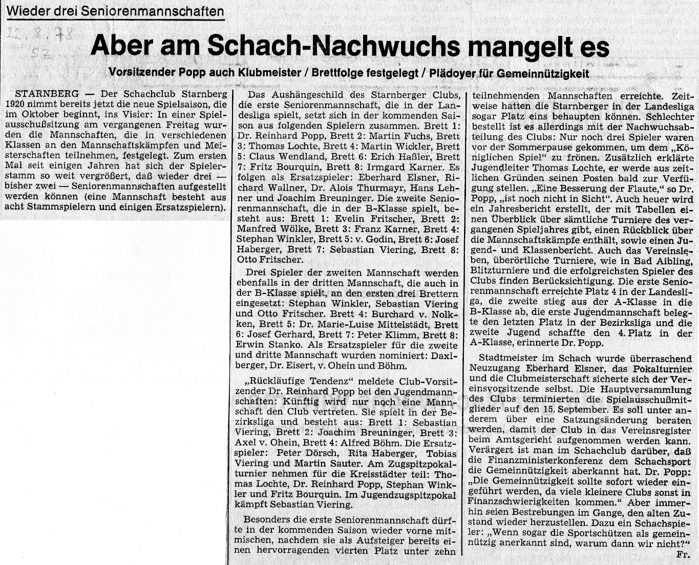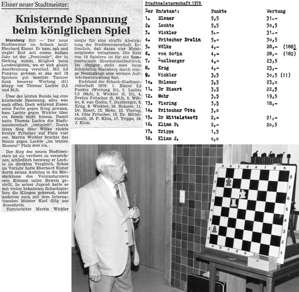Der SK Starnberg verfügte Ende der 70er-Jahr aber nicht über eine wiederbelebte Jugendabteilung, auch einige sehr spielstarke ältere Semester standen in seinen Reihen. Bestes Beispiel hierfür war Eberhard Elsner, der dem Verein im Dezember 1977 im Alter von 67 Jahren beitrat. Der Altmeister zeigte sein Können zunächst bei der Starnberger Klubmeisterschaft 1977/78, als er mit dem makellosen Ergebnis von fünf Siegen aus fünf Partien in die Meistergruppe aufstieg. Einen noch größeren Erfolg feierte er einige Wochen später – er setzte sich gegen mehrere der größten Nachwuchshoffnungen des Klubs durch und wurde Starnberger Stadtmeister!