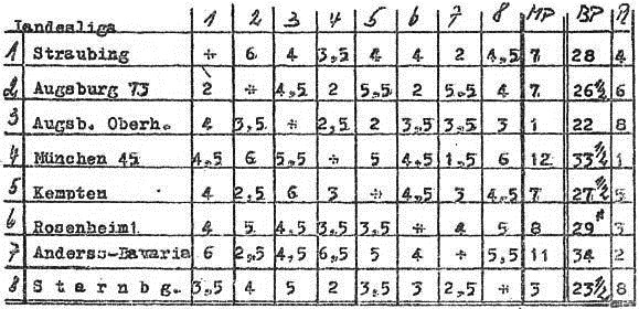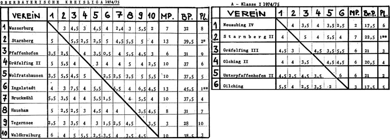 Hätte die SKS-Auswahl das Mannschaftsremis in der Schlussrunde verpasst, wäre der SK Wasserburg aufgrund der höheren Brettpunktzahl noch an den Starnbergern vorbeigezogen. So aber bedeuteten 19:3 Zähler für die Seestädter nach 1967 und 1969 (siehe Kapitel 4) den erneuten Gewinn der Oberbayerischen Mannschaftsmeisterschaft! Anders als bei den damaligen Triumphen berechtigte der Spitzenplatz in der höchsten oberbayerischen Liga aber nicht mehr automatisch zur Teilnahme an der Landesliga. Hierfür mussten die Starnberger nun in einem Rundenturnier mit den Siegerteams der Bezirksligen Münchens (SK Obermenzing), Niederbayerns (SK Passau) und Schwabens (Königsspringer Augsburg) einen der ersten beiden Plätze belegen.