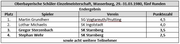 Diese fand von 29.-31.03.1980 in Wasserburg statt – und zeigte erstaunliche Parallelen zur Oberbayerischen Schüler-Mannschaftsmeisterschaft. Denn erneut sah es vor der Schlussrunde nach einem Starnberger Turniersieg aus. Wie bereits beim Zugspitz-Kreisturnier pflügte der junge Sterzenbach durch das zwölfköpfige Teilnehmerfeld und gab in den ersten vier Runden nur ein Remis ab. Damit ging er als Spitzenreiter in das finale Duell gegen den Vogtareuther Martin Grundherr. Trotz zwischenzeitlich deutlich besserer Stellung musste sich die SKS-Nachwuchshoffnung nach knapp fünf Stunden geschlagen werden. Damit landete Sterzenbach – wie schon mit dem Starnberger Schülerteam – auf dem Bronzerang. Zwischen ihm und Turniersieger Grundherr (4,5 Punkte aus fünf Partien) reihte sich noch Lothar Michaelis (4,0) vom SK Ingolstadt. Auch der zweite Starnberger Teilnehmer Stephan Wehr (2,5) spielte ein starkes Turnier. Er schloss den Wettbewerb direkt hinter Sterzenbach auf Rang vier ab.