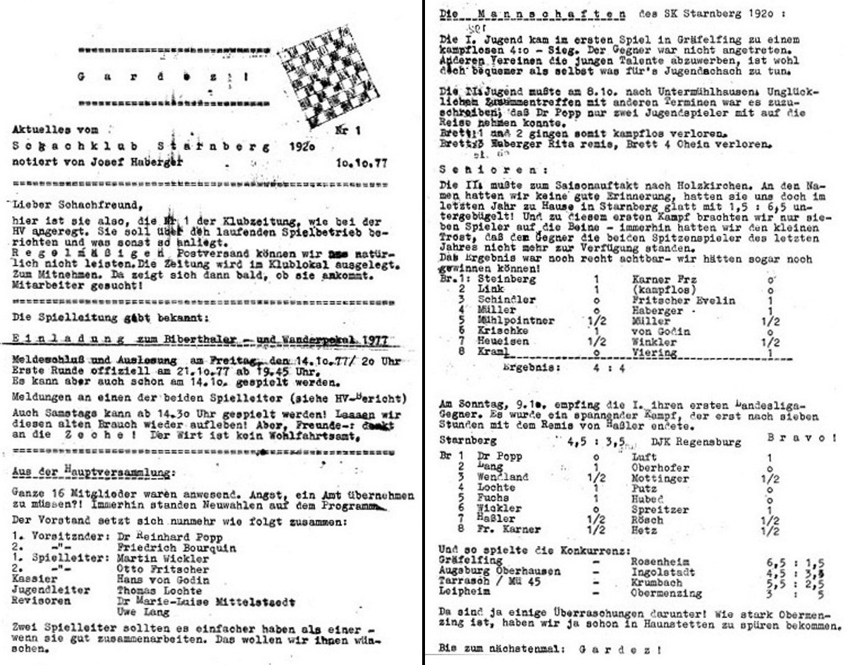 War Eberhard Elsners Sieg bei der Starnberger Stadtmeisterschaft 1978 zweifellos eine große Überraschung, so muss selbiges wohl auch über die Herausgabe der ersten Vereinszeitung des SK Starnberg gesagt werden. Verantwortlich hierfür zeichnete Josef Haberger. Der 51-jährige Stammspieler der 2. Mannschaft übte seit 1972 äußerst engagiert das Amt des SKS-Spielleiters aus und wurde 1976 bei der jährlich stattfindenden Sportlerehrung der Stadt Starnberg „für besondere Verdienste um den Klub“ geehrt. Dennoch war es etwas überraschend, dass Haberger die Erstellung einer Vereinszeitung übernahm. Denn erst wenige Wochen vor Erscheinen der Premierenausgabe am 10.10.1977 war er bei der Hauptversammlung des Klubs als Spielleiter zurückgetreten.