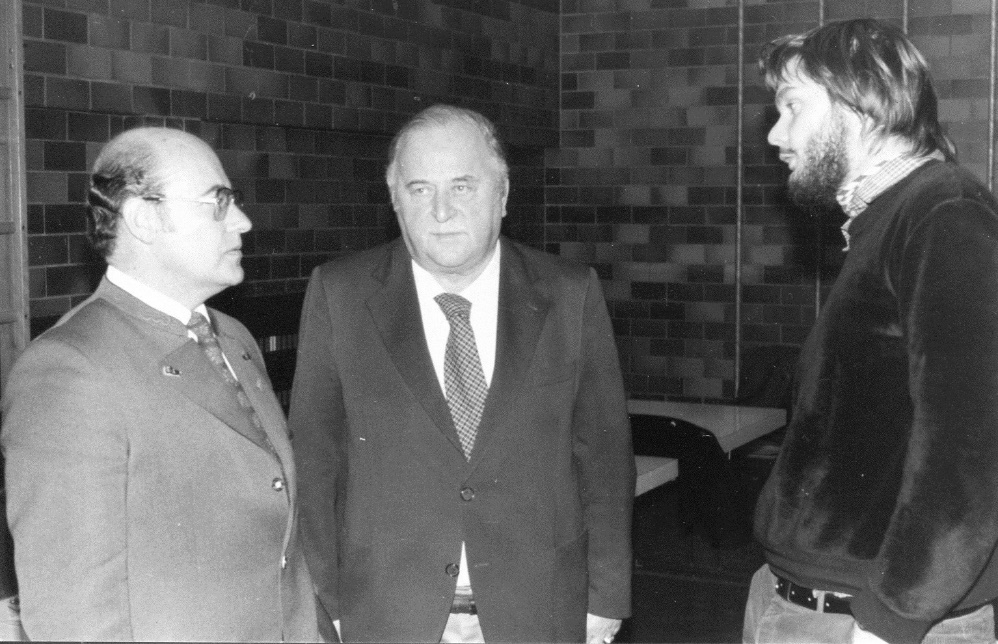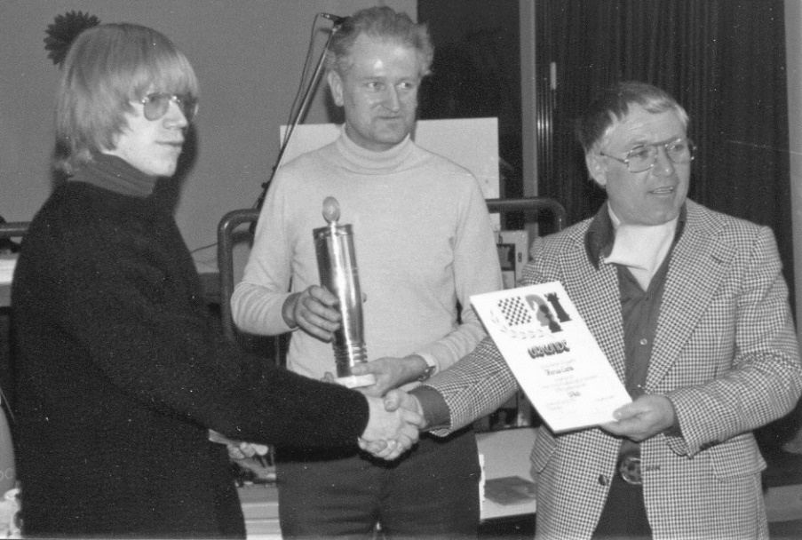 Ehre, wem Ehre gebührt: Alfred Distl (Mitte), Vorsitzender des gastgebenden SC Gröbenzell, überreichte Thomas Lochte (links) den Siegerpokal für das Meisterturnier der Zugspitz-Bezirkseinzelmeisterschaft 1978. Dritte Person auf dem Foto?? (Bildquelle: Archiv SK Starnberg).