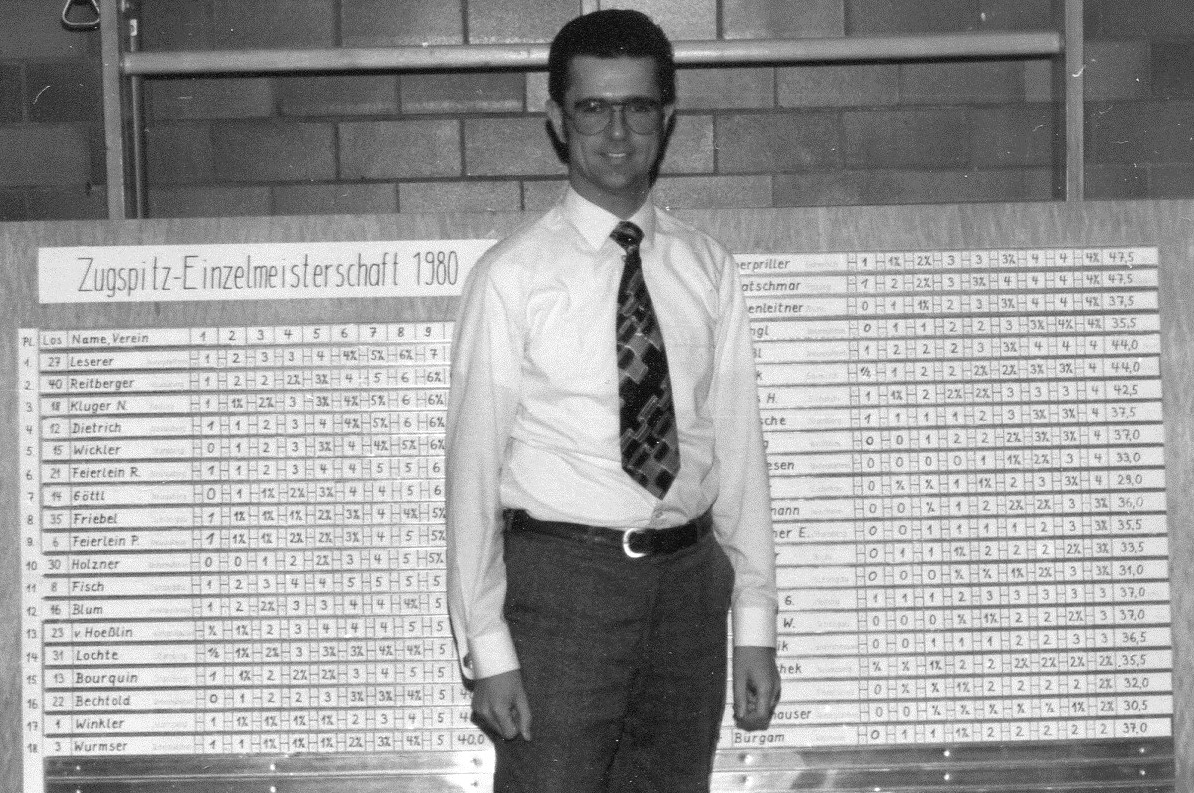 Man muss auch geben können: trotz des enttäuschenden Abschneidens seiner Klubkollegen machte SCS-Vereinsoberhaupt Dr. Reinhard Popp eine glänzende Figur als Gastgeber und Turnierleiter der Zugspitz-Einzelmeisterschaft 1980 in Starnberg (Bildquelle: Archiv SK Starnberg).
