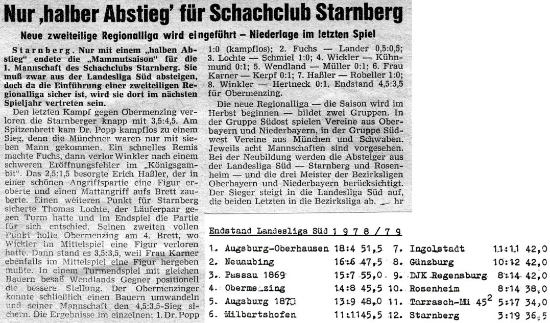 Vorläufiges Ende des Abenteuers Landesliga: nach einer katastrophalen Saison und lediglich 3:19 Mannschaftspunkten stieg Starnbergs „Erste“ 1979 als Tabellenletzter in die neu gegründete Regionalliga Südost (Bildquellen: Archiv SK Starnberg).