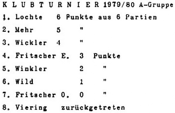 Sieben Starter für das älteste Vereinsturnier: nie zuvor in der seit 1920 ausgetragenen Starnberger Klubmeisterschaft nahmen so wenige Spieler teil wie in der Saison 1979/80. Die A-Gruppe stellte die einzige Spielklasse dar, eine B-Gruppe kam nicht zustande (Bildquelle: Archiv SK Starnberg).