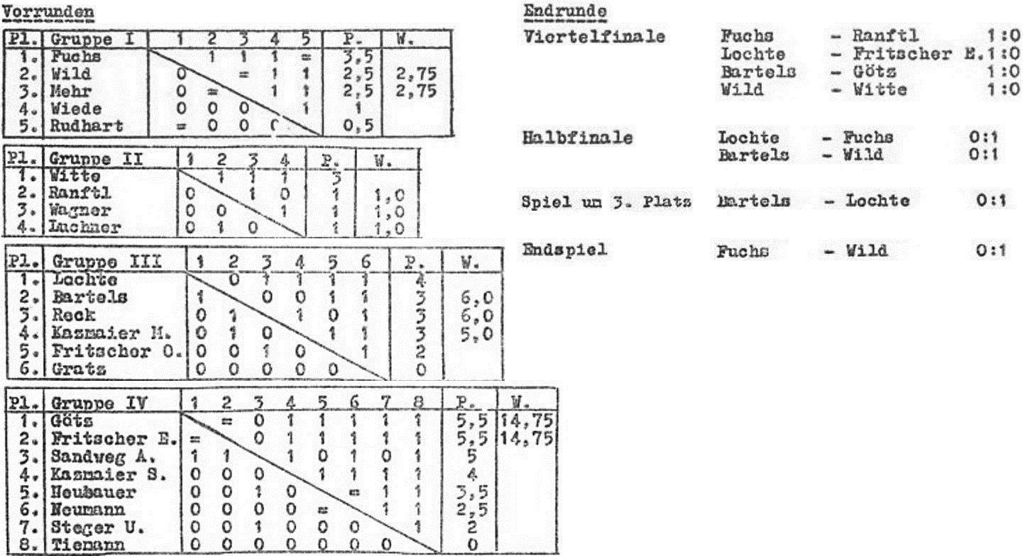 Bei der Stadtmeisterschaft griff schließlich auch Starnbergs bester Spieler Volker Wildt ins Turniergeschehen ein. Ähnlich wie Popp und Dr. Thümmler bei den vorherigen Klubwettbewerben agierte auch Wildt bei der Stadtmeisterschaft sehr souverän. In sechs Runden gab er nur gegen den zweitplatzierten Popp ein Remis ab, die übrigen Partien gewann er. Die Leistung von Popp (5,0 Punkte) war seinerseits kaum weniger überzeugend. Allerdings musste er nach einem weiteren Remis gegen den drittplatzierten Friedrich Bourquin (4,0) seine Titelhoffnungen begraben. So war es schließlich dem 33-jährigen Wildt vorbehalten, der erste Spieler in der Geschichte der Stadtmeisterschaft zu werden, der den Wettbewerb zum zweiten Mal für sich entschied.