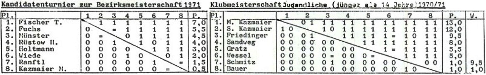 So fand von 26.02-02.04.1971 ein Rundenturnier mit acht jungen Denksportlern statt. Überlegener Sieger wurde der 15-jährige Thomas Fischer, der alle Partien gewann. Da der gebürtige Berliner als Favorit in den Wettbewerb gegangen war, hatte Popp als Ansporn für die weiteren Teilnehmer festgelegt, dass jeder Sieg gegen Fischer mit zwei Punkten und jedes Remis mit einem vollen Zähler belohnt werden sollte. Wegen Fischers Durchmarsch blieb es indes bei dem Versprechen. Auf den Plätzen 2-4 landeten Martin Fuchs (5,5 Punkte), Carsten Münster (4,5) und Hans-Joachim Rüstow (4,0). Auch sie durften bei der Bezirksmeisterschaft starten. Der fünfte Startplatz ging an Michael Kazmaier. Der 13-Jährige hatte in den Spielzeiten 1969/70 und 1970/71 jeweils die Klubmeisterschaft der Unter-14-Jährigen für sich entschieden.