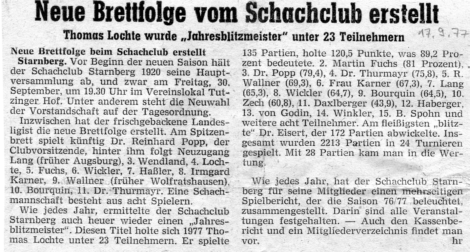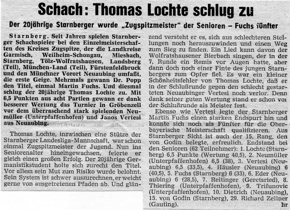Erfolgreiche Titelverteidigung: über Lochtes zweiten Erfolg bei der Starnberger Jahresblitzmeisterschaft im Herbst 1977 berichtete auch die regionale Presse (Bildquelle: Archiv SK Starnberg).