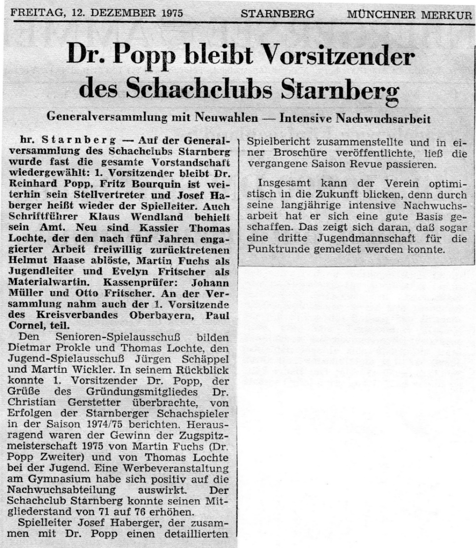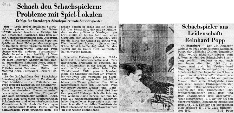 Das Jahr 1972 war nicht nur international aufgrund der Schacholympiade und dem legendären WM-Match Robert Fischer und Boris Spasski ein besonderes Schachjahr. Auch beim SK Starnberg ereignete sich damals ein historisch bedeutendes Ereignis: Reinhard Popp wurde zum 1. Vorsitzenden gewählt und sollte die Geschicke des Vereins für nicht weniger als 14 Jahre lenken! Der 26-jährige Student folgte als Klubchef Friedrich Bourquin. Dieser verzichtete nach nur einem Jahr im Amt auf eine weitere Kandidatur für den Vereinsvorsitz. Stattdessen wurde er für mehrere Jahre Popps Stellvertreter. Für Popp war die Leitung des SK Starnberg indes nur ein Amt unter vielen. Die Stammkraft der 1. Mannschaft führte weiterhin die Jugendabteilung des Klubs, seit 1969 war er zudem als Jugendleiter im Kreisverband Oberbayern tätig. Dem Spielausschuss der Bayerischen Schachjugend gehörte er ferner als Mitglied an.