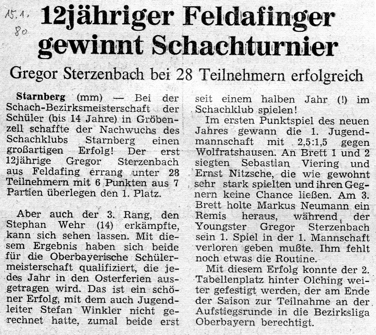 Besonders die beiden Erstgenannten zeigten ihr Talent auch in anderen Wettbewerben. Bei der im Januar 1980 in Gröbenzell ausgetragenen Jugend-Kreiseinzelmeisterschaft erzielte der 12-jährige Gregor Sterzenbach im Schülerturnier sechs Zähler aus sieben Runden und gewann souverän den Titel. Er qualifizierte sich damit ebenso wie sein zwei Jahre älterer Klubkollege Stephan Wehr (5,0) auf Rang 3 für die Oberbayerische Schüler-Einzelmeisterschaft.
