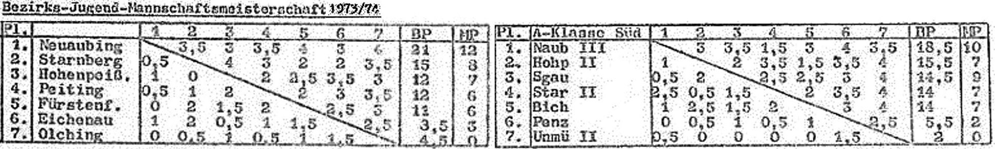 Trotz des intensiven Auswahlprozesses konnten die Starnberger Vertreter bei der Jugend-Bezirksmeisterschaft von 06.-10.04.1971 in Neuaubing nicht an die Erfolge ihrer Vorgänger in den 60er-Jahren (siehe Kapitel 4) anknüpfen. Kandidatenturnier-Sieger Thomas Fischer landete als bester Seestädter mit 3,5 Punkten aus sieben Partien auf Platz 5. Die übrigen Starnberger Teilnehmer zierten auf den Rängen 13-16 das Tabellenende. Gleich doppelt Grund zum Feiern hatte dagegen der Olchinger Clemens von Schmädel. Er wurde mit 5,5 Punkten zusammen mit dem punkt- und wertungsgleichen Neuaubinger Spieler Jäckel zum Turniersieger erklärt. Gleichzeitig wurde er am Schlussrundentag 19 Jahre alt! Von Schmädel sollte sich in den 90er-Jahren den Starnberger Schachspielern anschließen und dreimal Jahresblitzmeister werden (siehe Kapitel 7).