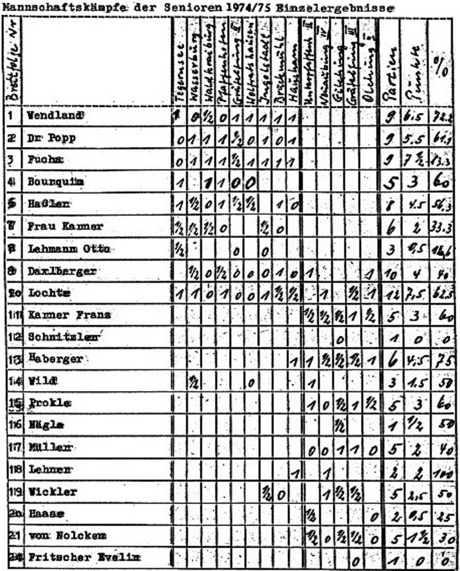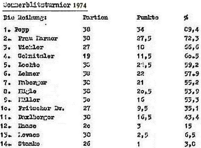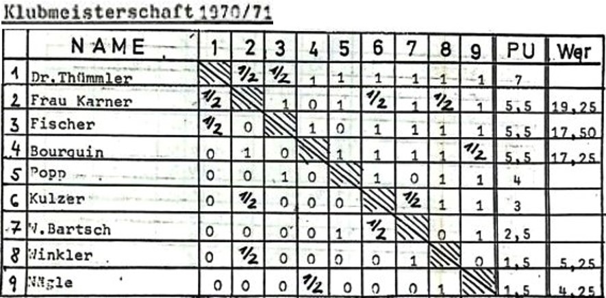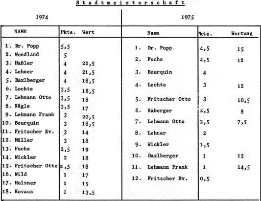 Minusrekord bei der Teilnehmerzahl, aber ein außergewöhnlicher Titelgewinn: mit Volker Wildt gewann im Jahr 1971 erstmals ein Spieler zum zweiten Mal die Starnberger Stadtmeisterschaft (Bildquelle: Archiv SK Starnberg).