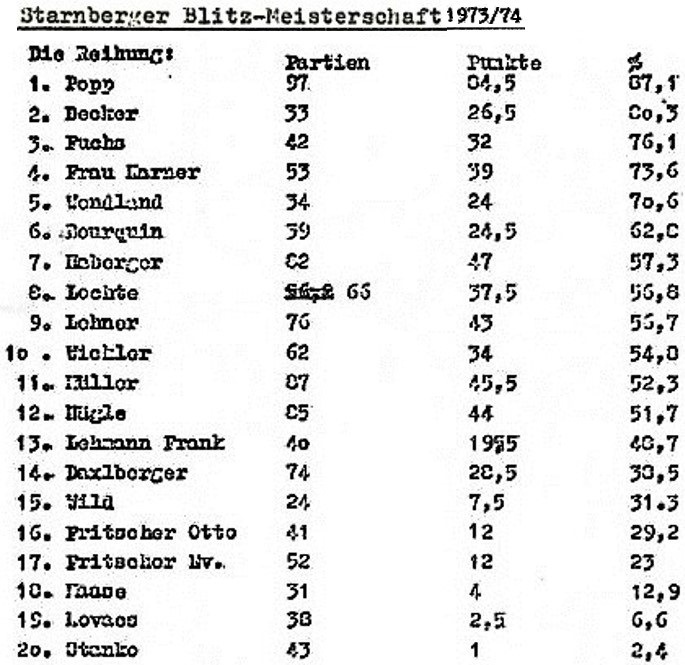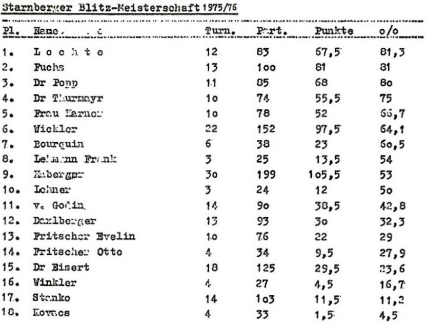 Noch am besten aus Starnberger Sicht schnitt Martin Wickler auf Rang 5 ab. Er kam wie die Zweit- und Drittplatzierten auf 6,5 Punkte, wies jedoch eine klar niedrigere Buchholzwertung auf. Deutlich unzufriedener mit seinem Abschneiden durfte Thomas Lochte gewesen sein. Der Turniersieger der Jahre 1978 und 1979 musste sich mit 5,0 Zählern und dem 14. Platz begnügen, gefolgt vom SCS-Vizevorsitzenden Friedrich Bourquin (15.) und Jugendleiter Stefan Winkler (17./alle 5,0). Auch die Bayerische Damen-Vizemeisterin Evelin Fritscher hatte sich wohl mehr als ihren 31. Platz (3,5) erhofft. Dagegen schlug sich der 16-jährige Ernst Nitzsche (26./4,0) achtbar und sammelte wertvolle Turniererfahrung.