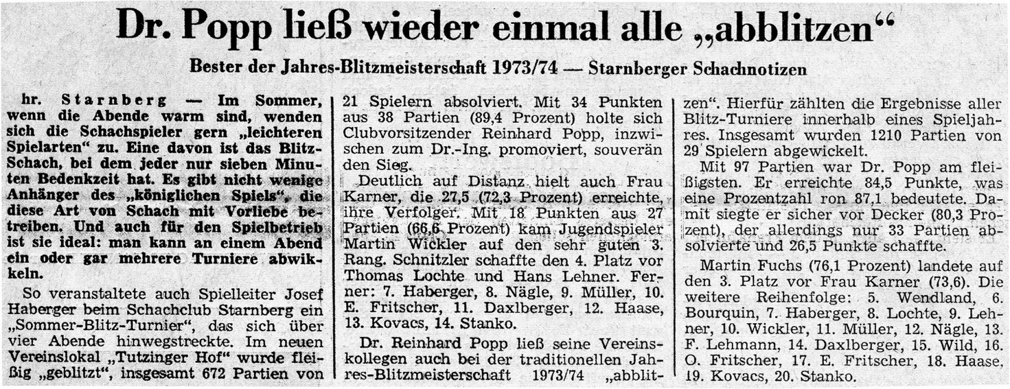 Eine weitere Premiere in der Starnberger Klubgeschichte ereignete sich Anfang Juli 1971 in Benediktbeuern. Als erster SKS-Akteur gewann der 25-jährige Reinhard Popp die oberbayerische Blitzschach-Einzelmeisterschaft. Obwohl sich der Starnberger Jugendleiter in der Spielvariante mit fünf Minuten Bedenkzeit sehr wohl fühlte und von 1972 bis 1974 die Starnberger Jahresblitzmeisterschaft gewinnen sollte, zählte er bei den Titelkämpfen in Benediktbeuern nicht zu den Favoriten. Bei der vorherigen Blitzschach-Einzelmeisterschaft im Schachbezirk Zugspitze musste Popp noch mit dem 10. Rang Vorlieb nehmen. Das Turnier gewann indes Popps Teamkollege Volker Wildt.