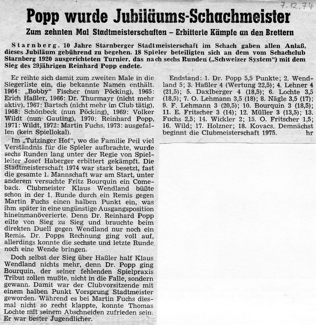 Denn der ungewollten Spielpause fiel auch ein Wahrzeichen der SKS-Schachsaison zum Opfer – die Starnberger Stadtmeisterschaft. Zum ersten Mal wurde der im Jahr 1964 aus der Taufe gehobene Wettbewerb nicht ausgespielt. Da dem Sieger der Stadtmeisterschaft traditionell vom amtierenden Starnberger Bürgermeister der von der Stadt gestiftete Wanderpokal überreicht wurde, fand auch dieses Szenario im Jahr 1973 nicht statt. Der Stadtverwaltung war aber durchaus daran gelegen, dass nicht nur den Starnberger Jugendlichen, sondern auch den erwachsenen Schachspielern geeignete Räumlichkeiten für die Ausübung ihres Sports zur Verfügung standen. Sie gewährte dem Verein daher als Reaktion auf einen Brief von Klubchef Reinhard Popp einen Zuschuss von 500,- D-Mark. Mit dem Geld sollte – sofern nötig – die Miete für einen Spielraum für die SKS-Senioren bezahlt werden.