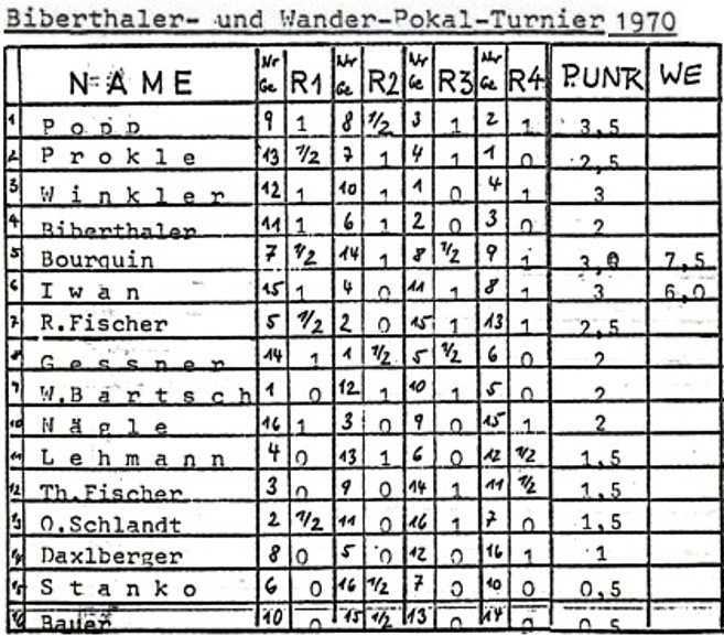Der SKS-Jugendleiter hatte den Wettbewerb bereits im Jahr zuvor für sich entschieden. Damit musste er das Turnier lediglich zwei weitere Male gewinnen, um den Biberhaler-Pokal endgültig behalten zu dürfen. Darauf sollte er aber mehrere Jahre warten müssen. Bei der Auflage vom 16.10-06.11.1970 war Popp indes eine Klasse für sich. In dem vierrundigen K.o.-Wettbewerb gab er lediglich in seiner Zweitrunden-Begegnung gegen Gerald Gessner ein Remis ab, bei den restlichen Partien triumphierte der 25-jährige Student. Den Vizerang sicherte sich Dietmar Prokle, Karl-Heinz Winkler kam auf Platz 3.