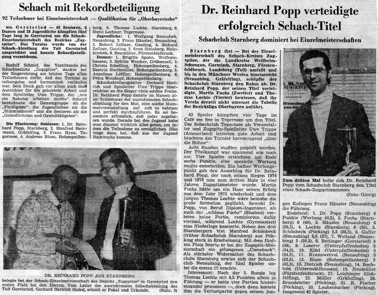 Trotz der zunehmenden Erfolge von Thomas Lochte hieß der fleißigste Titelsammler bei Starnberger Vereinsturnieren Ende der 70er-Jahre Dr. Reinhard Popp. Der SKS-Klubchef spielte besonders beim ältesten und prestigereichsten Wettbewerb, der Klubmeisterschaft, seine ganze Erfahrung aus. Er gewann das Turnier zwischen 1977 und 1979 drei Mal in Serie und konnte dabei in keiner einzigen Partie bezwungen werden.