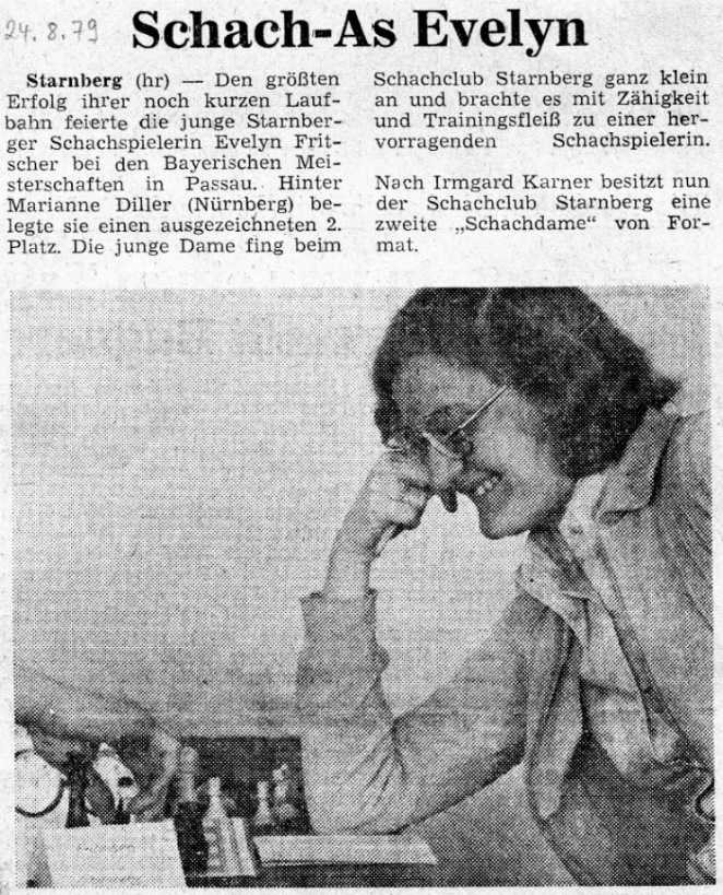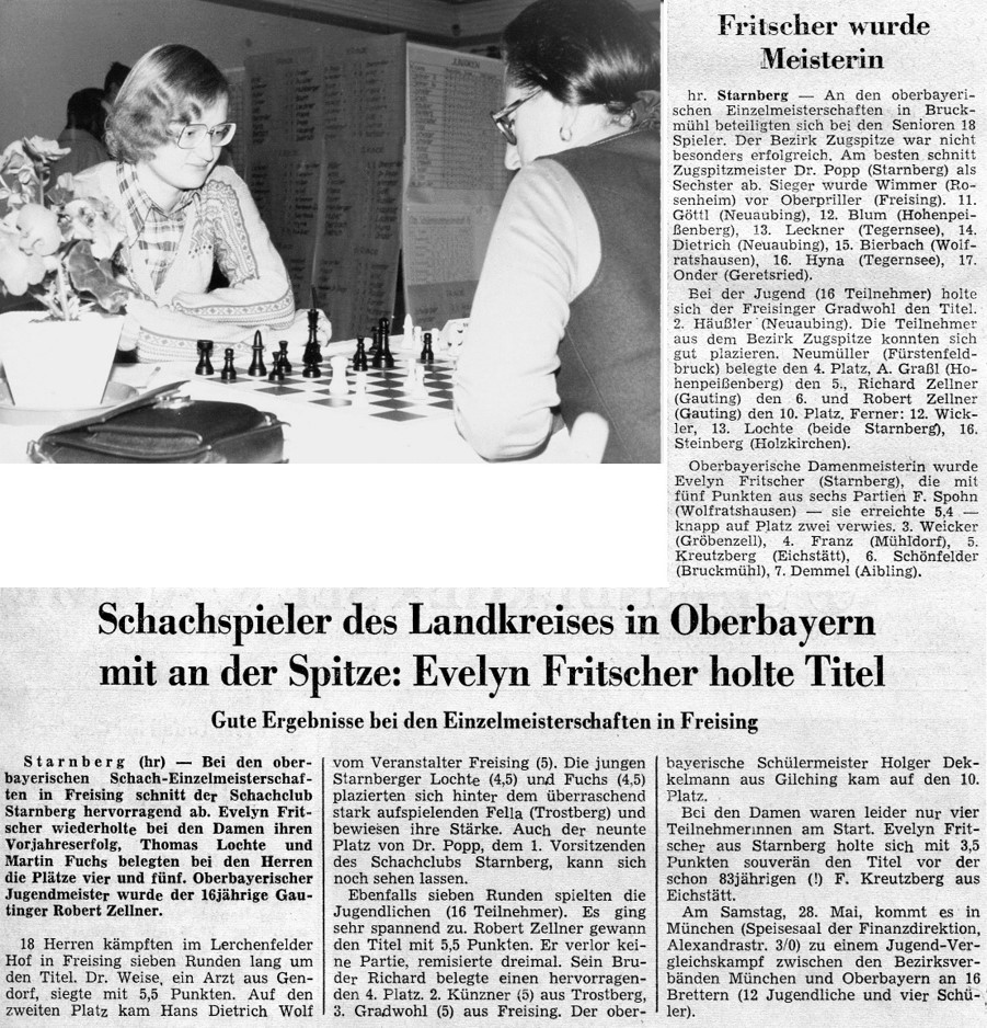 Ebenso wie in den 60er-Jahren waren auch zu Beginn der 70er-Jahre kaum Frauen im SK Starnberg vertreten. Trotzdem machten die wenigen Schachdamen im Verein regelmäßig auf sich aufmerksam. Zu ihnen zählte auch die junge Petra Morsbach. Nachdem sie im Alter von zwölf Jahren bei ihrer ersten Damenmeisterschaft im Bezirk Zugspitze in der Saison 1968/69 den vierten Platz belegt hatte (siehe Kapitel 4), errang sie in den beiden Folgejahren jeweils den Vizemeistertitel. Im Frühjahr 1972 war es dann aber endlich so weit: Morsbach gewann die Damen-Bezirksmeisterschaft! In einem doppelrundig ausgetragenen Wettbewerb ließ sie drei Spielerinnen aus Gröbenzell hinter sich. Sie folgte damit Inge Schönfelder, die im Jahr 1969 als letzte Starnbergerin den Titel in die Kreisstadt geholt hatte.