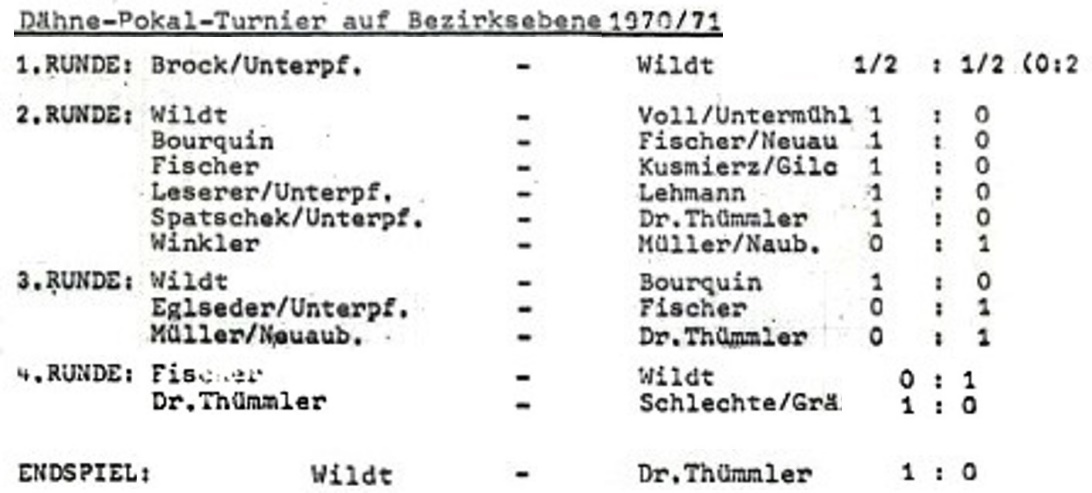 Während sie sich bei dem Starnberger Klubturnieren aus dem Weg gingen, trafen Volker Wildt und Dr. Manfred Thümmler schließlich im Dähne-Pokalturnier aufeinander – wenn auch erst im Finale auf Bezirksebene. Der Wettbewerb war wie in den Vorjahren auch in der Spielzeit 1970/71 fest in Starnberger Hand. Die Seestädter stellten im Bezirk Zugspitze nicht nur die beiden Finalisten, sondern mit Wildt, Vorjahressieger Dr. Thümmler und Robert Fischer auch drei der vier Halbfinalisten. Das mit Spannung erwartete Endspiel zwischen den beiden besten Starnberger Spielern entschied Wildt für sich. Der Architekt gewann damit die Bezirksausscheidung des Wettbewerbs zum siebten Mal – ein einsamer Rekord!