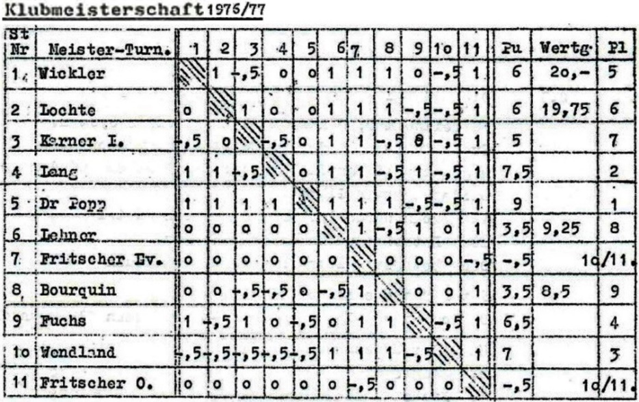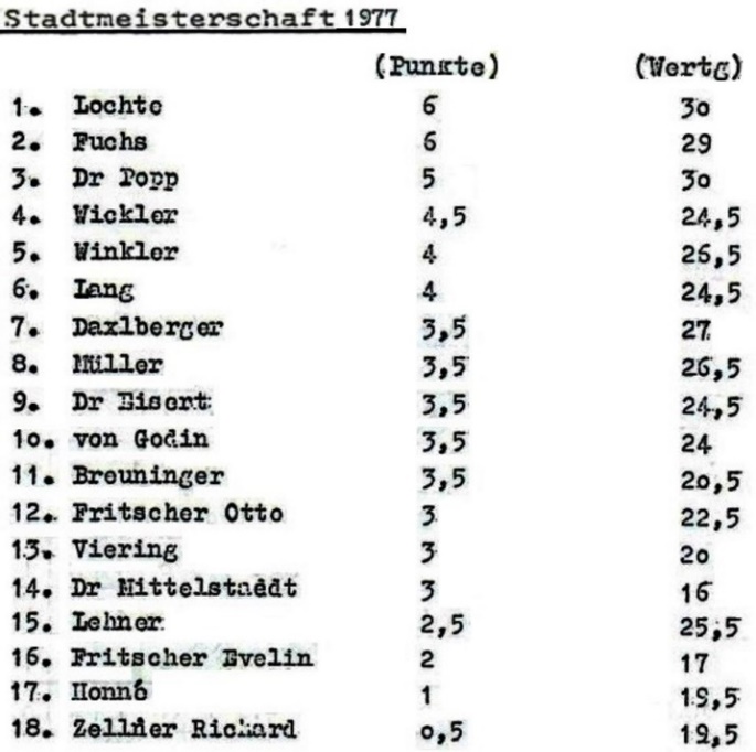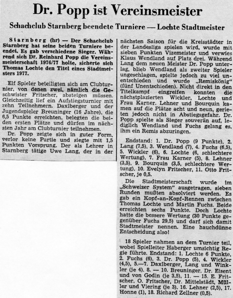 Der Dreikampf zwischen SKS-Klubchef Dr. Popp und den aufstrebenden Fuchs und Lochte prägte auch die Starnberger Stadtmeisterschaft im Jahr 1977 – und erneut setzte sich Lochte in einem Fotofinish durch! Mit sechs Zählern aus sieben Partien lag er am Ende gleichauf mit Titelverteidiger Fuchs. Doch ein einziger Wertungspunkt mehr für Lochte ließ das Pendel schließlich zu seinen Gunsten ausschlagen. Der dreimalige Turniersieger Dr. Popp musste sich indes mit 5,0 Punkten und dem Bronzerang begnügen.