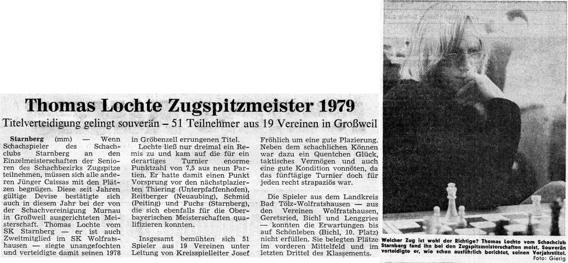 Thomas Lochte machte jedoch nicht nur bei Starnberger Vereinsturnieren auf sich aufmerksam, er reihte sich bald auch in die Liste der Starnberger Zugspitz-Einzelmeister ein. Nachdem bereits Dr. Reinhard Popp (1975, 1976, 1977) und Martin Fuchs (1974) das Bezirksturnier für sich entschieden hatten, setzte Lochte die Siegesserie der Kreisstädter in den Jahren 1978 und 1979 fort.