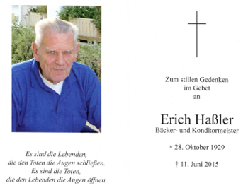 Erich Haßler trat am 13.01.1949 in den Schachklub Starnberg ein. In jungen Jahren wanderte er in die USA aus. Nach seiner Rückkehr nach Starnberg gewann er auf Anhieb die Stadtmeisterschaft 1964/65. Er war ein sehr starker Spieler und erzielte in der 1. Mannschaft viele Punkte für den Schachklub. Er war ein Vorbild für die Mannschaft. Auf ihn konnte man sich immer verlassen. Er war auch Mitglied im Deutschen Fernschachbund. Vor 30 Jahren übersiedelte er nach Ibiza, wo er eine Pension betrieb. Zuletzt verbrachte er seinen Ruhestand in San Antonio. Er starb am 11.06.2015 in Ibiza. Inzwischen wurde er nach Starnberg überführt und im Familiengrab beigesetzt.