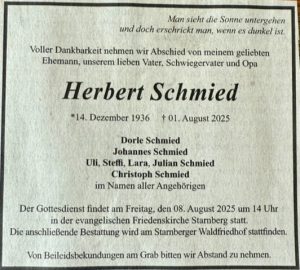 Am 1. August verstarb unser langjähriges Vereinsmitglied Herbert Schmied. Mit ihm verlieren wir nicht nur einen treuen Weggefährten, der unserem Club über 54 Jahre die Treue hielt, sondern auch einen leidenschaftlichen Schachspieler und engagierten Förderer der Jugend.