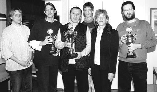 Im Schachclub Starnberg wurden die Sieger des erstmals ausgetragenen Schnellschach-Pokals des Kreiskrankenhauses geehrt. Von links nach rechts : Spielleiter Thomas Lochte (4.Platz), Matthias Schäfer (3.), Turniersieger Harald Feldbacher, Turnierleiter Johannes von Casimir (5.), Doris Glück (Leiterin des Pflegedienstes), Christoph Klamp (2.)